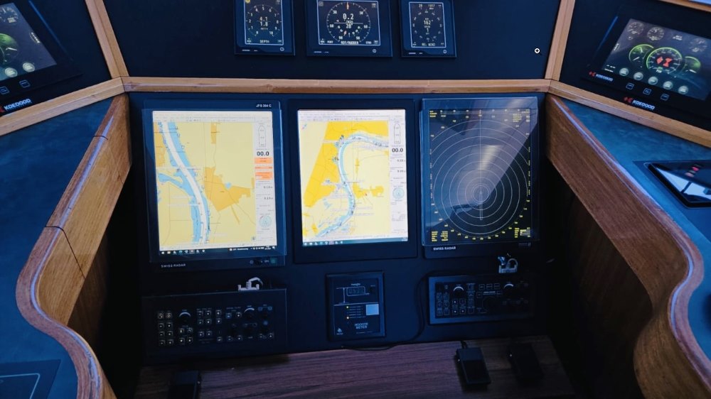 Omringd door twee Swiss Radar schermen plaatste Tresco Engineering in het midden de 19" Nirolo radarlook monitor voor hun Tresco systeem.